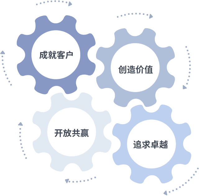 成就客户是一切决策的出发点,创造价值是衡量所有工作的标准,追求卓越是不凡成就非凡做事做人的态度,开放共赢是不凡成就非凡的格局也是最终的结果。价值观的齿轮环环相扣,推动着组织里的每个人不断向前。
